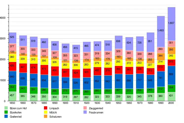 Fraubrunnen has a population (as of December 2020) of 5,203.[10] As of 2010, 5.9% of the population are resident foreign nationals.[11] Over the last 10 years (2000-2010) the population has changed at a rate of 11.9%. Migration accounted for 5.8%, while births and deaths accounted for 5.2%.[12]