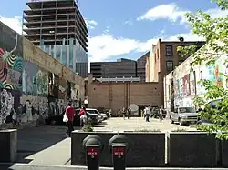 Freak Alley is a venue for public art in the form of murals and graffiti located in and adjacent to a service alley in downtown Boise, Idaho. The largest outdoor gallery in the Northwest,[1][2] and a Boise institution since 2002,[3] it began with a painting of a single alley doorway and now extends from the alley itself to a gravel parking lot.[4] Extant murals painted over and replaced by new murals (or incorporated into them) every two years;[5] collectively it is the work of more than 200 artists.[6] It has featured prominently in a survey of ten mid-sized American cities with thriving artistic communities in which Boise ranked second.[7] The site, along with the back of the Union Block, received a $500,000 renovation in 2018 from the city.[8]