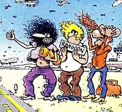 The majority of the comic books consist of one or more multi-page stories together with a number of one-page strips; many of the latter have a one-row skit featuring Fat Freddy's Cat at the bottom of the page. Issues #8-10 contained only the long-form story "The Idiots Abroad", which The Comics Journal listed as #44 of the "100 Greatest Comics of the Century."[7] The UK newspaper The Guardian said of a 2003 reprint of the story that, "The graphic quality is, even in slightly muddy reproduction, astonishing. Depictions of various European cities recall Hergé in their accuracy and detail ... As for the subject matter, considering the dates of composition, it has hardly dated."[8]