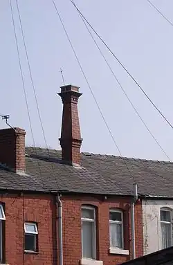 His first job that involved ladders was given to him while he still worked as a joiner. He was asked to point a garden wall and then the gable end of the customer's house. He used several short ladders, lashed together with rope and hardboard. This gave Dibnah valuable experience and his employer expanded the business to include property repairs.[16] Aged about 17–18 he climbed the 262-foot (80 m) chimney at Barrow Bridge, for a 10 shilling bet. During the night he took two Union flags to the top and secured each to the lightning conductors there. The Bolton Evening News reported the incident, with a photograph of Dibnah's feat, but attributed it to the activities of students from Manchester University.[17] At about the same time, Dibnah decided to replace the chimney stack at his mother's house on Alfred Street with one of his own design, as his mother used only one fireplace—leaving four of the five chimney pots redundant. As the single opening at the top of the new stack was only about 4 inches (10 cm) wide, the flue needed regular maintenance. On one occasion, he was cleaning the flue using a sack of bricks tied to a rope when the sack ripped open, breaking several pipes and flooding his mother's kitchen. After the death of his mother, the house was sold and the council placed a preservation order on the chimney, which remains standing as of 2007.[18]