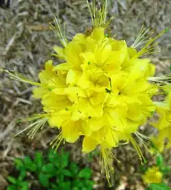 Fred Russell Hamilton was born in Raleigh, North Carolina during 1913. He graduated from the University of North Carolina in 1936 and went to work for Sears, Roebuck and Company as an auditor. Hamilton married the former Hazel Hampton in 1940. They had one son, born in 1944. The couple loved native azaleas and rhododendrons and during Fred's frequent travels, they collected specimens from locations around the globe and propagated many varieties in their greenhouse. Mr. Hamilton was an American Rhododendron Society member for many years[3] and developed the first domestic yellow azalea, Rhododendron flammeum, which he named after his wife.[4] The family also enjoyed the mountains and acquired a vacation home in Towns County, Georgia.[1]