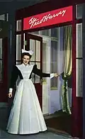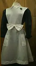 The women were subjected to a strict 10 p.m. curfew, administered by a senior Harvey Girl who assumed the role and responsibilities of house mother.[9] The official starched black and white uniform (which was designed to diminish the female physique) consisted of a skirt that hung no more than eight inches off the floor, "Elsie" collars, opaque black stockings, and black shoes. The hair was restrained in a net and tied with a regulation white ribbon. Makeup of any sort was absolutely prohibited, as was chewing gum while on duty. Harvey Girls (as they soon came to be known) were required to enter into a six-month employment contract, and forfeited half their base pay should they fail to complete the term of service. Marriage was the most common reason for a girl to terminate her employment.[9]