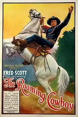 For a while, Scott did opera and stage performances before returning to Hollywood and becoming a leading man in many musical Westerns produced by Spectrum Pictures earning him the nickname "The Silvery-Voiced Buckaroo." His first starring role as a singing cowboy was 1936's Romance Rides the Range, and he subsequently starred in The Singing Buckaroo and Melody of the Plains (both 1937), Songs and Bullets (1938) and Two Gun Troubador (1939).[2] He made nearly two dozen films with comedy sidekick Al St. John, and some of his films were produced by Stan Laurel.[1]