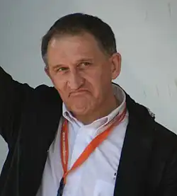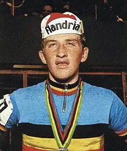 Freddy Maertens (born 13 February 1952) is a Belgian former professional racing cyclist who was twice world road race champion.[1] His career coincided with the best years of another Belgian rider, Eddy Merckx, and supporters and reporters were split over who was better.[2] Maertens' career swung between winning more than 50 races in a season to winning almost none and then back again. His life has been marked by debt and alcoholism.[2] It took him more than two decades to pay a tax debt.[2] At one point early in his career, between the 1976 Tour and 1977 Giro, Maertens won 28 out of 60 Grand Tour stages that he entered before abandoning the Giro due to injury on stage 8b. He achieved eight Tour stage wins, thirteen Vuelta stage wins and seven Giro stage wins in less than one calendar year.[3]