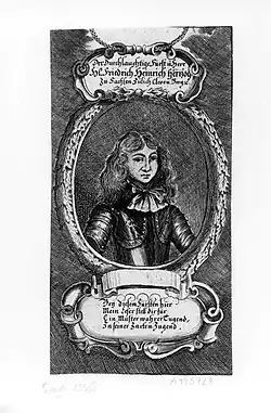 Frederick Heinrich of Saxe-Zeitz-Pegau-Neustadt (21 July 1668 in Moritzburg – 18 December 1713 in Neustadt an der Orla), was a German prince of the House of Wettin.