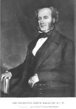 Frederick James Halliday was born on 25 December 1806 at Ewell, Surrey. According to the Oxford Dictionary of National Biography, he was educated at Rugby School.[1] However, a 1901 publication says that, although he went to Rugby in 1814, he entered St Paul's School, London in 1815, spent seven years there and thus "he may fairly be claimed as a Scholar of St. Paul's."[2] This is also the opinion of a historian of St. Paul's, Michael McDonnell, who notes that Halliday was sent to Rugby to be under the influence of its head master, John Sleath, and moved to St. Paul's as a consequence of Sleath being appointed as High Master there.[3] Subsequently, he attended the East India College in Haileybury, before joining the Bengal civil service in 1824.[1] He attended Fort William College in Calcutta, where he was taught by I. C. Vidyasagar.[4] His first office in the civil service was as an assistant working for the supreme court in 1825.[1]