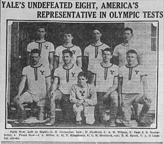 In 1924, he was part of the American Eights boat, which won the Olympic gold medal.[1] Sheffield graduated from Yale Law School in 1927 and practiced corporate law in New York City. He served as assistant U.S. Commissioner to the 1939-1940 New York World's Fair and as board chairman of the Carnegie Corporation of New York from 1966 until his death.[2] Sheffield died of a heart attack in Wilton, Connecticut (USA).[1]