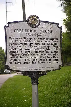 After serving in the American Revolutionary War under Francis Marion, he was arrested, escaped prison again, and fled to Tennessee.[1] He arrived at White's Creek on Christmas Day 1779, and is a signer of the Cumberland Compact, along with his son Jacob Stump who was killed by Native Americans in 1780.[4] Colonel Frederick Stump also built a log cabin home on the east side of White's Creek where he and wife Anna Snavely resided.Stump died about 1820