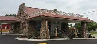 After the building left private ownership the property was exploited for commercial use and became a gas station. Despite the years and the changes in function the building's historical character remains intact. The front roof, over the canopy, has seen the most change. It was originally covered with red tile, matching the building. Also, the canopy is non-original but the pillars supporting are. The last gas station at the property closed in the early 1980s and it housed a restaurant until 2015.[2]