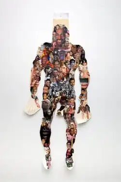 In 2019, Gordon Robichaux mounted a solo retrospective exhibition called "Happening".[2] The show included the then-current version of Weston's "Body Map" project, a collage begun in 2013, it was made from images and other small paper objects that he had, as one commenter said, "amassed over the last 30 years and cataloged in binders in different categories of race, gender, class issues, color, and other devices for organizing images".[28][29] "Body Map I" of 2015, shown here at right, contains images of prominent African-American men, including the face of Tom Morgan, the first openly gay president of the National Association of Black Journalists.[12]