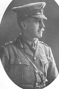 In January 1913, Wing was promoted to the temporary rank of brigadier general[14] and given command of the artillery of the 3rd Division and accompanied them to France in 1914 at the outbreak of the First World War. Wing, promoted to major general in October 1914, for “distinguished conduct in the Field”,[15] served at all the major battles of 1914 and was wounded on 22 September 1915 by a shrapnel bullet in the calf, but returned to duty the next day. Wing also had a close escape early in 1915, when a German shell burst directly over his car during a tour of his artillery positions. Wing was unhurt in the blast, but his chauffeur was wounded in the arm.[16] He temporarily commanded the 3rd Division from 29 October to 21 November, when Major General Aylmer Haldane took over as GOC.