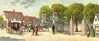 Frederiksberg Allé was finally opened to private traffic in 1833. The iron gate was dismantled in 1862 and later installed at Søndermarken's entrance on the corner of Pile Allé and Roskildevej. The south side of the street had long remained more open but in the years after 1850 it was built over with private villas.