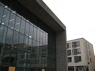 The school is located at an urban space which was created as part of the city's plan for the area around Frederiksberg Metro Station.[2] Fifty metres wide and three storeys tall, the glazed front opens to the school's assembly hall from where wide staircases give access to the basement and two upper floor. The two top floors offer a flexible teaching environment with a mixture of open and more closed rooms and visual contact across corridors and interior garden spaces. There are terraces facing the interior courtyard. The basement contains gyms and flex rooms.[3]