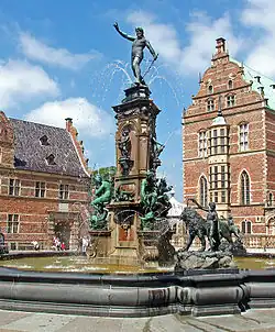 Designed by Adrien de Vries, the Neptune fountain is considered to be the castle's sculptural masterpiece. It was created from 1620 to 1622 to stand on the castle's forecourt symbolizing Denmark's position as a leading Nordic power in the early 17th century. The large bronze figures were cast in Prague where de Vries was employed as a sculptor by the imperial palace. Symbolizing the Danish king, the sea god Neptune is the central figure, while tritons piping their seashells decorate the outer basin.[8] The current fountain is a copy of the original which was dismantled by the Swedish troops in 1659 and taken to Sweden for war reparations following the Treaty of Roskilde in 1658. The reassembled fountain now stands in the gardens of Drottningholm Palace outside Stockholm.[19] The copy was made by Heinrich Hansen in 1888 with funding from J.C. Jacobsen.[10]