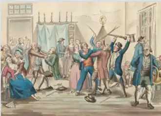 Quite a different tone is set in No. 40, Ge rum i Bröllops-gåln din hund! (Make room in the wedding-hall, you dog!), as some unruly soldiers interfere in a chaotic wedding, mixing roughly with the musicians and the wedding-party. Shouts of "Shoulder arms!" and panic at a chimney fire combine with a complex rhyming pattern to create a humorous picture of the disastrous event.[11] The story ends with the priest pocketing some of the collection money.[3] A later Epistle, No. 48, Solen glimmar blank och trind (The sun gleams smooth and round), narrates the relaxed and peaceful journey of a boat bringing Ulla Winblad home to Stockholm across Lake Mälaren on a lovely spring morning, after a night of carousing. The boatmen call to each other, apparently haphazardly, but each detail helps to create a pastoral vision as "Gradually the wind blows up / In the fallen sails; / The pennant stretches, and with an oar / Olle stands on a hayboat;". The song is "one of Bellman's greatest", creating "an incomparable panorama of that eighteenth-century Stockholm which meets us in Elias Martin's canvasses."[3]