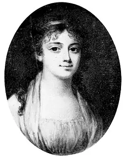 Likely from about 1780, Fredrica Löf was educated as a student in the French Theatre at Bollhuset in Stockholm under Jacques Marie Boutet de Monvel.[2] Anne Marie Milan Desguillons was likely also a mentor of hers. She probably performed in smaller parts, like other Swedish students, such as Lars Hjortsberg did. It was common for French actors of this period to adopt a stage name. This was not as common in Sweden, but Fredrica Löf, who was educated in the French Theatre, adopted the French version of her first name as a stage name and changed her surname to her father's original name, and called herself "Fredrique Löwen". Commonly however, she was still referred to as Fredrica Löf, and this is also the most common name by which she is referred to in literature.