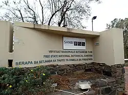 The Free State National Botanical Garden, located just outside Bloemfontein covers 70 hectares, and is home to about 400 species of plants, largely native to Free State and Northern Cape Provinces and Lesotho. Near Bain's Vlei, the garden was established in 1965, around 10 km north of downtown between picturesque dolerite rocks. 140 bird species, 50 mammal species, and 50 reptile species live in the park. A wild olive tree (Olea europaea subsp. africana) there is probably more than 200 years old. The herbarium preserves 50,000 species. There is also a bird hide, a dam, and wide lawns.[1][2]