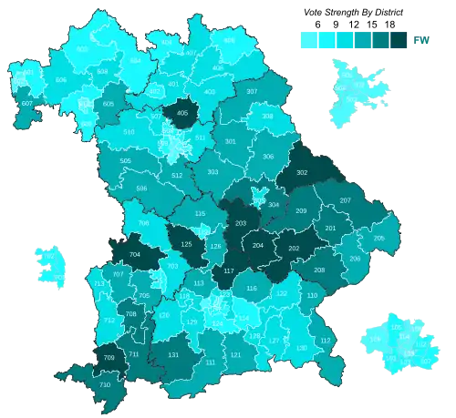 The FW Landesverband Bayern is divided into bezirk (regional) associations.[12] Even if the statute and association distinguish district and local associations, these do not exist as a subdivision of the state association but are completely independent voter groups. Not all local voter groups organized in the association necessarily have to be members of a voter group at the district level. Legally, these are two independent memberships. In a community, more than one voter group can be a member of the state association.