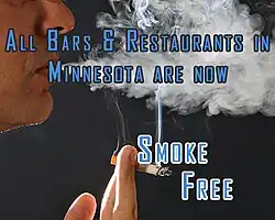 The earliest smoking ban in Minnesota was the Minnesota Clean Indoor Air Act (MCIAA), which took effect in 1975.[1] The purpose of this act was to enforce the "protection of the public health." It prohibited smoking in areas where children, ill or injured are present. This first Minnesota act also limited smoking indoors at public places and private meetings.
