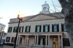 Freehold was officially designated as the seat of the Monmouth County government, and a court house was commissioned to be built on the land purchased from John Reid. The Monmouth Courthouse opened in 1715.[42] A small village quickly began to develop around the courthouse. At first, the village was called Monmouth Courthouse.[43] Over time, other government buildings opened near the courthouse, including a sheriff's office, a prison and a post office. A number of homes and commercial businesses also sprang up in the village, including a blacksmith, a general store, a bank, a hotel, and saloon.[44]