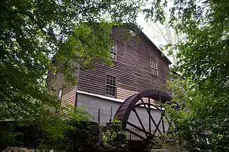 Originally, a miller's house was located just east of the mill but was destroyed by fire in the 1990s. The millstones were significant features, originally 48 inches in diameter, now 36 inches and weighing approximately 1,000 pounds each. The original wooden waterwheel was replaced with a historic breaststroke-type wheel, 20 feet high and 3 feet wide, running "backwards" with an 18-foot gear. The wooden dam was replaced circa 1910 with a shaped stone dam. A stone wall and series of gates and channels were added in 1946 to improve water control.[2]