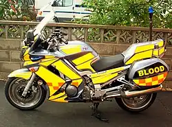 The latest Yamaha FJR1300 motorcycles are the first to be purpose-built for Blood Bike duties through an arrangement between NABB and Yamaha[18] with equipment designed and fitted by Woodway Engineering.[19]