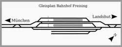 Freising station has four platform tracks next to two central platforms. The platforms are accessible via two tunnels. One connects with the station building and is equipped with lifts and ramps to make it accessible for the disabled. The other tunnel is at the northern end of the platform and has stairs only. Track 1 is served by Regionalbahn services to Landshut, Plattling and Regensburg. The through Regionalbahn services, Regional-Express and ‘’Alex’’ services towards Munich Hauptbahnhof stop on track 2. Track 3 is used by the S1 of the Munich S-Bahn, which connects Freising with the city of Munich at 20 minute intervals (with some 40 minute gaps). Track 4 is served by through trains towards Landshut and Passau or Regensburg and Nuremberg. To the southeast of the platform tracks there is a through track for overtaking and two sidings for the parking of S-Bahn trains overnight. The two sidings can only be reached from the Landshut side of the station, since the connection from the direction of Munich has been broken. Previously, there were other freight tracks, but these are out of operation. Sidings connected to the tractor manufacturers Schlüter and BayWa among others.