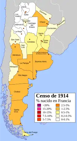 In 1810, Buenos Aires had a population of 28,528 inhabitants, including 13 French citizens.[6] At the beginning of the 19th century, French immigration to Argentina was not substantial. Mainly constituted of political exiles and former officers from the imperial army, it became more considerable from the year 1825, reaching up to 1,500-2,000 French immigrants some years.[7] In 1839, it was estimated that 4,000 Frenchmen were living in the province of Buenos Aires, this figure increased to 12,000 in 1842.[8] From the next decade, French people started to migrate to Argentina in large numbers.