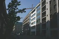 The embassy has approximately 250 employees and is one of France's largest.[12] The present embassy building was designed by Christian de Portzamparc, who won the 1997 competition for the commission after German reunification and the decision to return the government of the Federal Republic of Germany to Berlin from Bonn.[13][14] It is substantially on the original site, but the northern portion was exchanged in a land swap for a piece of land on Wilhelmstraße.[13] The public entrance is on this eastern side of the building, leading to the consular and informational section; private entrances for staff and official visitors on Pariser Platz lead to the western section which includes the official reception areas and the ambassador's residence on the top floor.[13][15] An auditorium and meeting rooms are in the centre of the building.[15] The eastern section includes a public sculpture courtyard, with one bronze showing damage from having previously stood in the old embassy building; there is a private garden on an upper level in the western section, overlooked by a line of birch trees from the Himalayas.[13][14][15][16] The Recouverte, the two-storey-high passage through the building between Pariser Platz and Wilhelmstraße, was intended to be open to the public, and is paved like the pavement outside to encourage visitors, but is closed for security reasons.[12][13][17][18][19][20][21] The interior decoration is by the architect's wife, Elizabeth de Portzamparc, with art deco touches in the ambassadorial residence.[19][22]