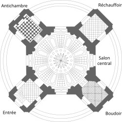 The pavilion is called "French" because of its location in the centre of the formal garden.[39] It is a model of Rococo architecture. Its plan is centred, in the shape of a St Andrew's cross. In fact, this motif is rendered by the outline of an octagon flanked by four rectangular hors d'oeuvre cabinets,[9] all set within a circular representation marked by the external steps. This perfect, centred plan follows in the footsteps of contemporary architects, while retaining only the essentials, giving the building a character that is more brilliant than grandiose.[40]