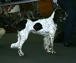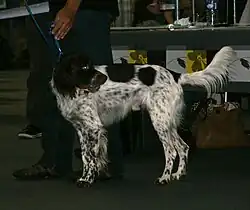 A normal dog has a muscular appearance with a deep chest and strong legs. The French Spaniel has eyes of a dark amber colour, and a thick tail that tapers towards the tip. The hair is medium, dense, with long feathers on the ears, backs of the legs and tail. It has some waviness on the chest and otherwise lies flat on the body. The normal colour of a French Spaniel's coat is white with brown markings rather in shade from a light cinnamon to dark liver.[3] Historically, the coat was only white with black markings, but the breed was mixed with other colours of Spaniels during the 19th century.[22]