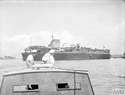 Béarn sailed for Manila, capital of the Philippines, on 19 March to load supplies and returned on 11 May after demobilizing some of her long-term crew. The ship spent the next month ferrying supplies and material between ports in Indochina. On 10 June, she loaded 450 troops, including 419 wounded men, aboard and departed for Toulon. Slowed by boiler problems en route, the transport arrived on 23 July and was assigned to the special reserve on 1 October. On 9 December 1948 Béarn was assigned to the Groupe d'Action Anti-Sous-Marine (Anti-Submarine Action Group (GASM)) as its flagship. This initially consisted of a group of dedicated anti-submarine ships, the Groupe des Bâtiments de Surface (GBS) and a group of submarines, the Groupe des sous-marins disponibles (GSMD), with the transport serving as a submarine tender. The GBS was disbanded on 15 September 1950 and the GSMD reverted to its original name, 1re Escadrille de sous-marins (1st Submarine Flotilla), on 1 October. By 1952, only the five-inch guns remained aboard. The number of crewmen berthed aboard Béarn fluctuated, but it averaged about 800 men, which taxed the ship's cooking and sanitation facilities. In 1955, she became the first ship in the Marine nationale to be fitted with a television receiver. The GASM was disbanded on 10 October 1960 and the ship was relegated to service as a barracks ship, although she retained her torpedo workshop. Her maintenance costs kept rising to the point that it became cheaper to build a barracks for the submarine crews in 1966. Béarn was condemned and renamed Q 419 on 31 March 1967. The ship was sold for scrap on 4 September and towed to Savona, Italy, four days later to be broken up.[52] Over the course of her long career, Béarn never launched her aircraft in combat.[11]