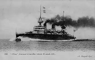 Ordered on 3 April 1897,[19] and named after the French victory at the Battle of Jena,[20] Iéna was laid down at the Arsenal de Brest on 15 January 1898.[5] She was launched on 1 September and completed (armement définitif) on 14 April 1902 at a cost of F25.58 million.[21] Five days later the ship departed for Toulon, losing one man overboard and having some problems with her rudder en route, before arriving on 25 April. Iéna became Marquis' flagship as commander of the Second Division of the Mediterranean Squadron on 1 May and was docked for repairs during 14–31 May. After the completion of the repairs the ship began a series of port visits in France and French North Africa which would be repeated for most of her career. She spent most of January 1903 refitting and was inspected by King Alfonso XIII of Spain during a visit to Cartagena in June. After another refit from 20 August to 10 September, Iéna, together with the rest of the Mediterranean Squadron, visited the Balearic Islands in October. During the return voyage, two crewmen died while training with the manual steering gear in heavy seas. Marquis was relieved by Rear-Admiral Léon Barnaud on 3 November. Iéna conducted training exercises off the coast of Provence from 19 November to 17 December.[22]