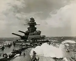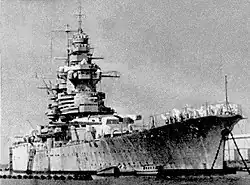 For the next few weeks, Richelieu was occupied with shooting drills with her primary and secondary batteries and tests for the anti-aircraft radars and command systems. Now assigned to Force 63 of the East Indies Fleet, Richelieu sortied on 8 April to take part in Operation Sunfish, another bombardment of Sabang while aircraft scouted possible landing beaches near the city of Padang on the coast of Sumatra. The ships allocated for the operation consisted of Richelieu, Queen Elizabeth, two heavy cruisers, two escort carriers, and five destroyers. Early on 11 April, the two battleships, one of the cruisers, and three destroyers bombarded the island while the other vessels conducted the reconnaissance operation. Richelieu fired seven salvos with her main battery and used her secondary guns to once again silence the coastal battery on the island. Japanese aircraft launched a poorly-coordinated attack on the battleships but they failed to score any hits. After further carrier operations around Padang, the fleet returned to port on 20 April.[61][62]