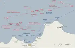 Two days later, Strasbourg and Dunkerque sortied to intercept reported German and Italian ships that were incorrectly reported to be in the area. The French had received faulty intelligence that had indicated that the Germans would attempt to force a group of battleships through the Strait of Gibraltar to strengthen the Italian fleet. After the French fleet got underway, reconnaissance aircraft reported spotting an enemy fleet steaming toward Gibraltar. Supposing the aircraft to have spotted the Italian battle fleet steaming to join the Germans, the French increased speed to intercept them, only to realize that the aircraft had in fact located the French fleet. The fleet then returned to port, marking the end of Strasbourg's last wartime operation.[20] On 22 June, France surrendered to Germany following the Battle of France.[13][21][22] Under the terms of the Armistice, Strasbourg and Dunkerque would remain at Mers-el-Kébir.[23]