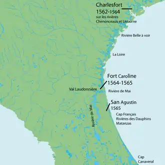 In 1562, Charles IX, under the leadership of Admiral Gaspard de Coligny sent Jean Ribault and a group of Huguenot settlers in an attempt to colonize the Atlantic coast and found a colony on a territory which would take the name of the French Florida. They discovered the sound and Port Royal Island, which would be called Parris Island in South Carolina, on which he built a fort named Charlesfort. The group, led by René Goulaine de Laudonnière, moved to the south where they founded the Fort Caroline on the Saint John's river in Florida on June 22, 1564.[16]