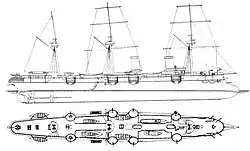 The ship was armed with a main battery of four 164.7 mm (6.48 in) M1881 28-caliber guns and a secondary battery of six 138.6 mm (5.46 in) M1881 30-cal. guns. All of these guns were placed in individual pivot mounts; the 164.7 mm guns were in sponsons located fore and aft, with two guns per broadside. Four of the 138.6 mm guns were in sponsons between the 164 mm guns, one was in an embrasure in the forecastle and the last was in a swivel mount on the stern. For close-range defense against torpedo boats, she carried twelve 47 mm (1.9 in) M1885 3-pounder Hotchkiss guns, and eight 37 mm (1.5 in) M1885 Hotchkiss revolver cannon. Alger also carried a pair of 65 mm (2.6 in) M1881 16-cal. field guns that could be sent ashore with a landing party. She was also armed with five 356 mm (14 in) torpedo tubes in her hull above the waterline. Two were in the bow, one per broadside, and the fifth was in the stern.[2][4]