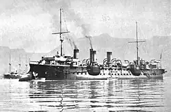 Bugeaud was transferred to the Levant Division in 1897, but engine problems forced her to return to Toulon for repairs, her place in the division being taken by the cruiser Suchet. Bugeaud was reassigned to the Mediterranean Squadron after repairs were completed later that year.[9][10] She was still in service with the squadron in 1898.[11] Later that year, she was deployed to the coast of Ottoman Syria, where she relieved Amiral Charner as the flagship of the Levant Division. The unit at that time also included the torpedo cruisers Vautour, Faucon, and Condor.[12] The divisional commander at the time was Vice Admiral Édouard Pottier. During this period, she served with the International Squadron that intervened in the Cretan Revolt. She carried Prince George of Greece and Denmark to Crete, where he became the High Commissioner of the Cretan State, part of the negotiated settlement to the conflict. The International Squadron was thereafter disbanded.[13]
