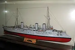 D'Entrecasteaux was sent to Durazzo and Cattaro on 25 January 1919 as part of the fleet that monitored the transfer of ex-Austro-Hungarian Navy ships to the victorious Allied powers.[34] On 5 September 1919, she was assigned to the training division based in Brest.[25] She was later involved in the repatriation of elements of the Armée d'Orient (Army of the East) from Macedonia. On 2 July 1920, the ship was placed in reserve at Brest and was decommissioned on 1 June 1921. She was struck from the naval register on 27 October 1922 and transferred temporarily to the Belgian Navy the following year, being towed to Zeebrugge on 24 May 1923.[34][35] She was used as a depot ship for ex-German torpedo boats that had been abandoned in Belgium after the war, serving in that role until mid-1926, when the Belgians disbanded the torpedo boat flotilla.[25] The Belgians had made significant reductions in their naval budget and had no further need for the cruiser. The ship was towed to Cherbourg on 4 February, where she remained until 7 March 1927, when the French sold her to the Polish Navy.[34][35]