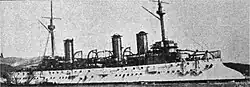 D'Entrecasteaux, named for Admiral Antoine Bruni d'Entrecasteaux,[19] was built at the Société Nouvelle des Forges et Chantiers de la Méditerranée shipyard in La Seyne-sur-Mer. She was ordered on 8 November 1893 and was laid down in June 1894, was launched on 12 June 1896, and was commissioned on 1 January 1898 to begin sea trials.[20] During testing on 28 April, one of her boilers burst, scalding four stokers badly and delaying her completion by six months.[21] The ship was completed in early 1899 and was placed in full commission on 15 February.[20] She was immediately ordered to the Far East to join the Division navale d'Extrême-Orient et du Pacifique occidental (Naval Division of the Far East and Western Pacific) and serve as its flagship, where she replaced the old ironclad Vauban. After departing on 6 April, she reached Saigon in French Indochina on 12 May, where she joined the protected cruisers Descartes, Pascal, and Jean Bart. Rear Admiral de Courejolles hoisted his flag aboard D'Entrecasteaux on 1 June and she thereafter embarked on a long voyage around East Asia, sailing as far north as China.[20][22]