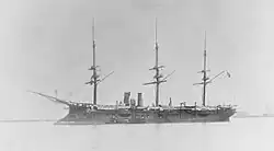 In 1893, Duguay-Trouin was sent abroad again, this time to the Pacific station.[8] In August that year, one of the ship's 164.7 mm guns accidentally exploded during target practice while she was in Papeete, Tahiti. The shell that had been loaded into the gun exploded on the deck, and five men of the gun crew were seriously injured, of whom four died, though several others received less serious injuries. The gun was destroyed and Duguay-Trouin received significant damage from the explosion; parts of the gun were thrown as far as 76 m (250 ft).[26][27] In December 1894, Duguay-Trouin visited Yokohama, Japan, and fired salutes to mark her visit.[28] The ship was transferred to French Indochina in 1895, where Bayard still served as the squadron flagship. The unit also included the protected cruisers Isly and Alger and the unprotected cruisers Forfait and Beautemps-Beaupré [29]