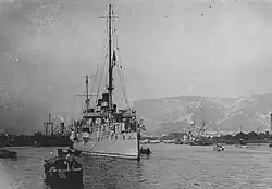 In May 1913, Jurien de la Gravière was mobilized to join the active component of the Mediterranean Fleet, serving in the role of répétiteur (signal relay ship).[8] She sailed on 20 October in company with the battleships of the 1st Squadron and six torpedo boats to make a show of force during a period of tension between Italy and the Ottoman Empire. The French ships visited Alexandria, Egypt, where they were visited by thousands of people. They then steamed north past Cyprus on 3 November, then back west to Messina, Italy, two days later. On the way there, they met the German battlecruiser SMS Goeben. The fleet then returned to the eastern Mediterranean, visiting a series of ports in Ottoman Syria. The ships then steamed to the Dardanelles straits, where the commander, Admiral Augustin Boué de Lapeyrère, transferred from his flagship, the pre-dreadnought Voltaire, to Jurien de la Gravière, to enter the straits and make an official visit to the Ottoman capital, Constantinople. The fleet then sailed to Salamis, Greece, to meet King Constantine I of Greece aboard his fleet's flagship, the armored cruiser Georgios Averof on 28 November. After a week visiting other Greek ports, the French vessels stopped in Porto-Vecchio in Corsica before rejoining the rest of the Mediterranean Fleet at Porquerolles. They arrived back in Toulon finally on 20 December.[24]