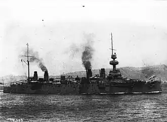 Marseillaise, named after the French national anthem,[7] was authorized in the 1898 Naval Program and was ordered from the Arsenal de Brest on 19 June 1899. The ship was laid down on 10 January 1900, launched on 14 July 1900, and completed in October 1903.[8] The cost of her construction was 22,031,750 francs. Marseillaise was initially assigned to the 1st Cruiser Division (1re Division de croiseurs) of the Northern Squadron. The ship carried President of France Emile Loubet to Naples, Italy, for a state visit in April 1904 and was then transferred to the Light Squadron (Escadre légère) of the Mediterranean Squadron in October. By September 1905, she was flagship of Rear Admiral (Contre-amiral) Paul Campion, commander of the squadron, and remained as such until she was briefly placed in reserve in July 1907.[9]