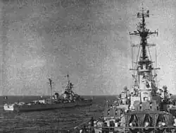 Recalled to the Force de Raid in May,[10] Montcalm was then moved to Algiers in North Africa[11][12] where she stayed, performing at least one convoy escort,[13] until the Destruction of the French Fleet at Mers-el-Kebir, when she was ordered to Toulon. On 9 September 1940, she left Toulon with her sister ships Gloire and George Leygues,[14] and passed Gibraltar without being challenged (for which the local British commander, Admiral Sir Dudley North, was relieved of his command).[15] The flotilla refuelled at Casablanca and continued to Dakar, arriving on 14 September.