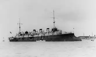Assigned to the Escadre du Nord (Northern Squadron), the ship represented France during Queen Victoria's Diamond Jubilee Fleet Review at Spithead in June 1897 and then conveyed the President of France, Félix Faure, from Dunkerque to Russia the following August. Pothuau was transferred to the Escadre de Méditerranée (Mediterranean Fleet) in 1898 where she became flagship of the Escadre Légere (Light Squadron).[3] During the annual naval maneuvers in June–July 1900, the ship was the flagship of Contre-Amiral (Counter Admiral) Maréchal[9] who was relieved by Contre-Amiral Caillard several months later.[10] Around May 1904 the ship was relieved as the flagship of the Mediterranean Fleet's Cruiser Squadron[11] and she was placed into reserve in mid-1905. Pothuau was recommissioned on 17 April 1906 to serve as a gunnery training ship[3] and became flagship of the combined gunnery school under Contre-Amiral Le Bris in 1910.[12] During this time the ship tested a fire-control system,[13] and continued as a gunnery training ship through July 1914.[3]