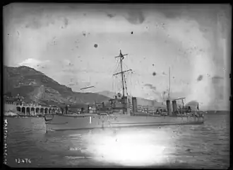 Carabinier was ordered from Ateliers et Chantiers de Saint-Nazaire Penhoët and was launched at their shipyard in Saint-Nazaire on 10 October 1908. She was completed in October 1909.[4] During the preliminary stages of the Battle of Antivari, Montenegro, on 16 August, the 1st, 4th and 5th Destroyer Flotillas were tasked to escort the core of the 1st Naval Army while the 2nd, 3rd and 6th Flotillas escorted the armored cruisers of the 2nd Light Squadron (2e escadre légère) and two British cruisers. After reuniting both groups and spotting the Austro-Hungarian protected cruiser SMS Zenta and the destroyer SMS Ulan, the French destroyers played no role in sinking the cruiser, although the 4th Flotilla was sent on an unsuccessful pursuit of Ulan. Having broken the Austro-Hungarian blockade of Antivari (now known as Bar), Vice-Admiral (Vice-amiral) Augustin Boué de Lapeyrère, commander of the 1st Naval Army, decided to ferry troops and supplies to the port, escorted by the 2nd Light Squadron and the 1st and 6th Destroyer Flotillas while the rest of the 1st Naval Army bombarded the Austro-Hungarian naval base at Cattaro, Montenegro, on 1 September. Four days later, the fleet covered the evacuation of Danilo, Crown Prince of Montenegro to the Greek island of Corfu. The 2nd Flotilla bombarded Stončica Lighthouse on the island of Lissa on 19 September. The flotilla escorted multiple small convoys loaded with supplies and equipment to Antivari, beginning in October and lasting for the rest of the year, always covered by the larger ships of the Naval Army in futile attempts to lure the Austro-Hungarian fleet into battle. The Naval Army raided Lissa and the island of Lastovo on 2 November with the destroyer Lansquenet entering Vis harbor and extorting a ransom from the townsmen lest the French bombard the town. As they departed, the French shelled the lighthouse again.[5]