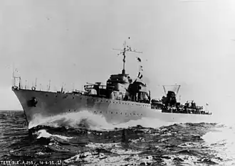 Both the 8th and 10th Scout Divisions were assigned to the Force de Raid at Brest when war was declared in September 1939; it made only a single sortie as a complete unit on 2–6 September when it responded to an erroneous report that German ships had left port. Afterwards it was dispersed into smaller groups to search for German commerce raiders and blockade runners.[10] During 21–30 October, the Force de Raid, including all of the Le Fantasques, screened Convoy KJ 4 against a possible attack by the heavy cruiser Admiral Graf Spee. On 25 November, together with Le Fantasque and the heavy cruiser Dupleix, Le Terrible captured the 4,627-gross register ton (GRT) German merchantman SS Santa Fé.[11] The ships of the 10th Scout Division escorted the Strasbourg and the British aircraft carrier Hermes as they searched for German ships in the Central Atlantic 7–13 November. The division escorted Strasbourg and the heavy cruiser Algérie back to France on 18 November.[12] The battleship Dunkerque sailed for Canada on 11 December with a cargo of gold and she was escorted for the next two days by Le Terrible, Le Triomphant, Valmy, Mogador and Volta.[13]