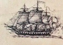 On 28 May, Latouche received instructions from Ambassador La Luzerne to patrol the mouth of the Delaware River from 26 June. Latouche decided to take advantage of the free time this left him to cruise off New York and intercept British communications.[21] On 2 June, Hermione captured the 100-ton brigantine Thomas, laden with butter, candles and soap.[23] On 6, she intercepted Rewrery, laden with salt.[23] Latouche sent them both to Providence.[21]