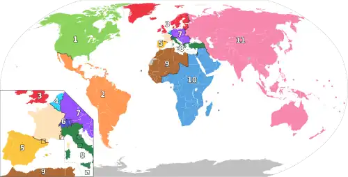 The Americas are divided into two constituencies, North and South (1 and 2); Europe into six (3 to 8), with the eighth constituency also incorporating Israel; Africa is divided into two (9 and 10), with the tenth constituency also incorporating the Arabian peninsula as well as Iraq, Syria and Lebanon. The eleventh constituency, the largest, includes every other country in Asia, as well as the entirety of Oceania, along with Belarus, Moldova and Ukraine.