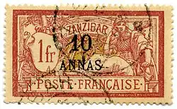 In 1902 French stamps of the "Type Blanc", "Type Mouchon", and "Type Merson" design were issued for use. These stamps incorporated the word "Zanzibar" as a part of the design, but still overprinted with denominations in annas. Stamps of this design were not regularly issued without the surcharge in annas.